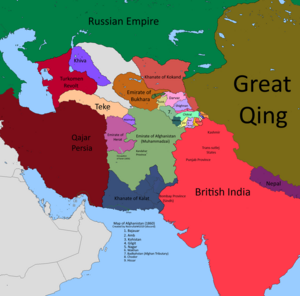 In January 1843, Yar Mohammad Khan turned against Iran and made a treaty with the ruler of Bukhara, Nasrullah Khan.[10] Herat recognized Bukharan sovereignty over Kabul, Khulm, and Balkh while Bukhara recognized Yar Mohammad's right to the Chahar Wilayat. With the backing of Bukhara, in the winter of 1843–44, Yar Mohammad forced the Hazaras of Qala-e Naw to pay tribute,[10][7][15] although this tribute was pretty nominal.[6]