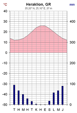 Heraklion has a hot-summer Mediterranean climate (Csa in the Köppen climate classification). Summers are warm to hot and dry with clear skies. Dry hot days are often relieved by seasonal breezes. Winters are mild with moderate rain. Because Heraklion is further south than Athens, it has a warmer climate during winter but cooler during summer because of the Aegean Sea. The maximum temperature during the summer period is usually not more than 28 - 30 °C (Athens normal maximum temperature is about 5 °C higher). The minimum temperature record is -0.8 °C in the airport while in the port it has never dropped below 0 °C. Snowfalls are rare with the last significant snowfall with a measurable amount on the ground occurring in February 2004. [27] Heraklion falls in 11a hardiness zone. [28]