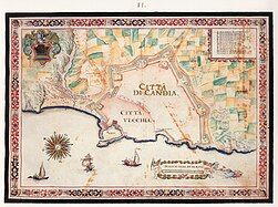 During the Cretan War (1645–1669), the Ottomans besieged the city for 21 years, from 1648 to 1669, the longest siege in history up until that time. In its final phase, which lasted for 22 months, 70,000 Turks, 38,000 Cretans and slaves and 29,088 of the city's Christian defenders perished.[15] The Ottoman army under an Albanian grand vizier, Köprülü Fazıl Ahmed Pasha conquered the city in 1669.