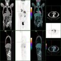 PET/CT of a staging exam of colon carcinoma. Besides the primary tumor a lot of lesions can be seen. On cursor position: lung nodule.