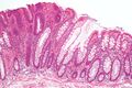 Colorectal adenocarcinoma is distinguished from a colorectal adenoma (mainly tubular and ⁄or villous adenomas) mainly by invasion through the muscularis mucosae.[10]