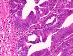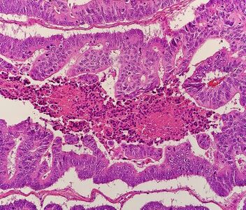 The histopathology of colorectal carcinoma involves analysis of tissue taken from a biopsy or surgery. A pathology report contains a description of the microscopical characteristics of the tumor tissue, including both tumor cells and how the tumor invades into healthy tissues and finally if the tumor appears to be completely removed. The most common form of colon cancer is adenocarcinoma, constituting between 95%[2] to 98%[3] of all cases of colorectal cancer. Other, rarer types include lymphoma, adenosquamous and squamous cell carcinoma. Some subtypes have been found to be more aggressive.[4]