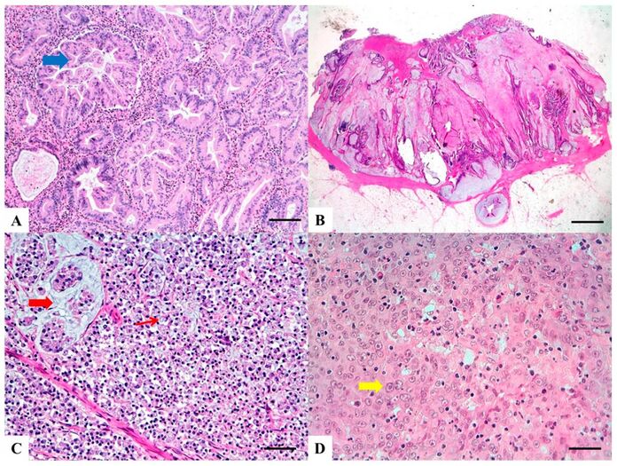 (C) Carcinoma with osseous metaplasia: osseous metaplasia (blue arrow) is recognized in conventional CRC as foci of bone formation in the stroma, with calcification, osteoid matrix, osteoclasts and osteoblasts.