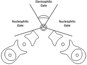 Given the dual ability of chalcogens to serve as donor and acceptor molecules for σ-hole interactions, a geometric schematic has been generated to distinguish between the differing bonding character. The σ* orbital is exactly opposite the σ bonds to a chalcogen bond. It is the region between the σ-holes in which the lone pairs localize in a donor region. These regions have been referred to as the nucleophilic gate, the σ-hole regions which are electron depleted, and the electrophilic gate, the donor region which is electron enriched.[8]