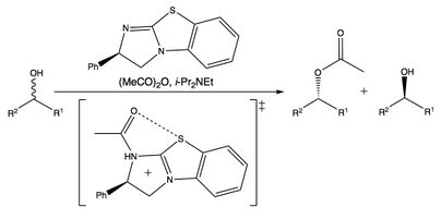 Chalcogen bonding in catalysis has been used to pre-orient substrate, allowing for asymmetric/stereoselective catalysis on the preferred conformation of the substrate. Examples include an asymmetric acyl transfer on an enantiomeric mixture catalyzed by a chiral isothiourea. The acyl group is first transfer on to the chiral catalyst which is purported to go through a transition state featuring a 1,5 chalcogen bonding interaction on the catalyst which orients the acyl group prior to transfer on to the substrate. This resulted in one enantiomer of the substrate acylated and the remaining substrate enriched in the other enantiomer.[15] Similar interactions have been invoked in stereoselective Michael additions and β-lactonizations.[16]