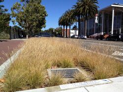 Bioswales are stormwater runoff systems providing an alternative to traditional storm sewers. Much like rain gardens, bioswales are vegetated or mulched channels commonly placed in long narrow spaces in urban areas. They absorb flows or carry stormwater runoff from heavy rains into sewer channels or directly to surface waters.[70] Vegetated bioswales infiltrate, slow down, and filter stormwater flows that are most beneficial along streets and parking lots.[31]
