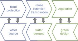 However, it is apparent that the term “blue-green infrastructure” is applied in an urban context and places a greater emphasis on the management of stormwater as an integral part of creating a sustainable, multifunctional urban environment.[30] At the building level, the term "blue-green architecture" is used, which implements the same principles on a smaller scale. The focus here is on building greening with water management from alternative water resources such as grey water and rainwater.[32]