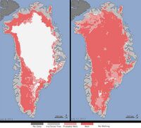 In the last two or three decades, global warming has reduced the size of glaciers throughout the Arctic and earlier this year, news sources confirmed what climate scientists already knew: water, not rock, lay beneath this ice bridge on the east coast of Greenland. More islets are likely to appear as the sheet of frozen water covering the world's largest island continues to melt.[98]