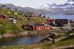 As of 2021, Greenland has a population of 56,421.[150] That same year, 18,800 people resided in the capital city Nuuk. Nearly all Greenlanders live along the fjords in the south-west of the main island, which has a relatively mild climate.[151] Whereas the majority of the population lives north of 64°N in colder coastal climates, Greenland's warmest climates such as the vegetated area around Narsarsuaq are sparsely populated.
