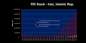 Stock of FDI in Iran equaled $16.82 billion (at home) and $2.075 billion (abroad) according to The World Factbook statistics in 2010.[14]