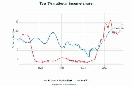 The Soviet system in the USSR is economically very equal, so in Soviet Russia, Filip Novokmet estimates that the top 10% of income earners held 2.2 to 2.7 times the national average income (compared with 4.5 times in 2015 in Russia), and the top 1% of income earners held 3.5 to 5.5 times the national average income (compared with 20 times in 2015 in Russia).[23]