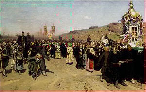 Beginning shortly before the assassination of Tsar Alexander II of Russia in 1881, he painted a series of pictures dealing with the theme of the Russian revolutionary movement: "Refusal to Confess," "Arrest of a Propagandist," "The Meeting," and "They did not Expect Him," the last of which is undoubtedly his masterpiece on the subject, mixing contrasting psychological moods and Russian and Ukrainian national motifs. His large-scale "Religious Procession in the Province of Kursk" is sometimes considered an archetype of the "Russian national style" displaying various social classes and the tensions among them set within the context of a traditional religious practice, united by a slow but relentless forward movement.