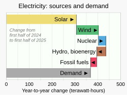 97. Wiatros-Motyka, Małgorzata; Rangelova, Kostantsa (7 October 2025). "Global Electricity Mid-Year Insights 2025". Ember. p. 4. https://ember-energy.org/app/uploads/2025/10/Global-Electricity-Mid-Year-Insights-2025-PDF.pdf. "Solar and wind outpaced demand growth in the first half of 2025. ... This led to renewables overtaking coal’s share in the global mix and prevented further increases in CO2 emissions from the power sector."