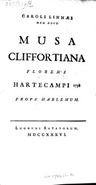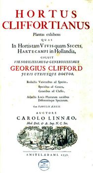 His work at Hartekamp led to another book, Hortus Cliffortianus, a catalogue of the botanical holdings in the herbarium and botanical garden of Hartekamp. He wrote it in nine months (completed in July 1737), but it was not published until 1738.[69] It contains the first use of the name Nepenthes, which Linnaeus used to describe a genus of pitcher plants.[81][note 4]