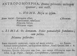 Linnaeus classified humans among the primates beginning with the first edition of Systema Naturae.[167] During his time at Hartekamp, he had the opportunity to examine several monkeys and noted similarities between them and man.[168] He pointed out both species basically have the same anatomy; except for speech, he found no other differences.[169][note 6] Thus he placed man and monkeys under the same category, Anthropomorpha, meaning "manlike."[170] This classification received criticism from other biologists such as Johan Gottschalk Wallerius, Jacob Theodor Klein and Johann Georg Gmelin on the ground that it is illogical to describe man as human-like.[171] In a letter to Gmelin from 1747, Linnaeus replied:[172][note 7]