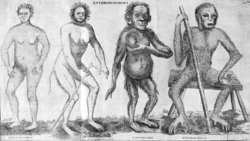 The theological concerns were twofold: first, putting man at the same level as monkeys or apes would lower the spiritually higher position that man was assumed to have in the great chain of being, and second, because the Bible says man was created in the image of God[173] (theomorphism), if monkeys/apes and humans were not distinctly and separately designed, that would mean monkeys and apes were created in the image of God as well. This was something many could not accept.[174] The conflict between world views that was caused by asserting man was a type of animal would simmer for a century until the much greater, and still ongoing, creation–evolution controversy began in earnest with the publication of On the Origin of Species by Charles Darwin in 1859.