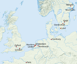 In April 1735, at the suggestion of Sohlberg's father, Linnaeus and Sohlberg set out for the Dutch Republic, where Linnaeus intended to study medicine at the University of Harderwijk[58] while tutoring Sohlberg in exchange for an annual salary. At the time, it was common for Swedes to pursue doctoral degrees in the Netherlands, then a highly revered place to study natural history.[59]