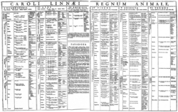 The first edition of Systema Naturae was printed in the Netherlands in 1735. It was a twelve-page work.[146] By the time it reached its 10th edition in 1758, it classified 4,400 species of animals and 7,700 species of plants. People from all over the world sent their specimens to Linnaeus to be included. By the time he started work on the 12th edition, Linnaeus needed a new invention—the index card—to track classifications.[147]