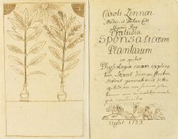 In 1729, Linnaeus wrote a thesis, Praeludia Sponsaliorum Plantarum on plant sexual reproduction. This attracted the attention of Rudbeck; in May 1730, he selected Linnaeus to give lectures at the University although the young man was only a second-year student. His lectures were popular, and Linnaeus often addressed an audience of 300 people.[40] In June, Linnaeus moved from Celsius's house to Rudbeck's to become the tutor of the three youngest of his 24 children. His friendship with Celsius did not wane and they continued their botanical expeditions.[41] Over that winter, Linnaeus began to doubt Tournefort's system of classification and decided to create one of his own. His plan was to divide the plants by the number of stamens and pistils. He began writing several books, which would later result in, for example, Genera Plantarum and Critica Botanica. He also produced a book on the plants grown in the Uppsala Botanical Garden, Adonis Uplandicus.[42]