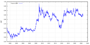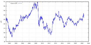 The euro is the second-most widely held reserve currency after the U.S. dollar. After its introduction on 4 January 1999 its exchange rate against the other major currencies fell reaching its lowest exchange rates in 2000 (3 May vs sterling, 25 October vs the U.S. dollar, 26 October vs Japanese yen). Afterwards it regained and its exchange rate reached its historical highest point in 2008 (15 July vs US dollar, 23 July vs Japanese yen, 29 December vs sterling). With the onset of the 2008 financial crisis, the euro initially fell, to regain later. Despite pressure due to the euro area crisis, the euro remained stable.[130] In November 2011 the euro's exchange rate index – measured against currencies of the bloc's major trading partners – was trading almost two percent higher on the year, approximately at the same level as it was before the crisis began in 2007.[131] In mid July 2022, the euro and the US dollar traded at par for a short period of time during an episode of dollar appreciation.[13] On 8 October 2025, it recorded a new high against the Japanese yen during a long period of depreciation of the latter.[132]