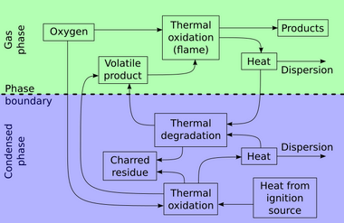 Smoldering is the slow, low-temperature, flameless form of combustion, sustained by the heat evolved when oxygen directly attacks the surface of a condensed-phase fuel. It is a typically incomplete combustion reaction. Solid materials that can sustain a smoldering reaction include coal, cellulose, wood, cotton, tobacco, peat, duff, humus, synthetic foams, charring polymers (including polyurethane foam) and dust. Common examples of smoldering phenomena are the initiation of residential fires on upholstered furniture by weak heat sources (e.g., a cigarette, a short-circuited wire) and the persistent combustion of biomass behind the flaming fronts of wildfires.