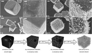 7(OH) cubes during a hydrothermal treatment at 200 °C. Initially amorphous cubes gradually transform into ordered 3D meshes of crystalline nanowires as summarized in the model below.