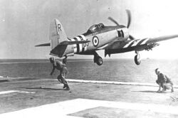 Invasion stripes were re-introduced on United Kingdom and Australia n Fleet Air Arm aircraft operating during the Korean War in 1950. Similar stripes were also used early in the war on F-86 Sabres of the 4th Fighter Interceptor Wing as a deviation from the standard yellow stripes.[citation needed]