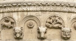 If mason's marks were the sign of the comacini, then evidence of their work has been found in several parts of Europe, as far as the capitals of the crypt in the cathedral of Lund. The "Como-Pavian" architectural sculpture is recognized in the cathedral of Modena and its Torre della Ghirlandina,[5] in central[6] and southern Italy, west across Languedoc to Iberian Peninsula, across southern Germany as far as Hungary, and even in England.[7]