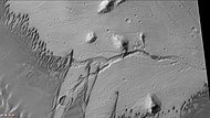 Orson Welles is an impact crater in the Coprates quadrangle of Mars, located at 0.2° S and 45.9° W. It is 124.5 kilometers in diameter and was named after Orson Welles (1915–1985), an American radio and motion picture actor and director. He is famous for, among other things, his radio broadcast of The War of the Worlds by H. G. Wells in which Martians invade Earth.[1] The layers and the clay minerals found in Orson Welles Crater are evidence that it once contained a lake.