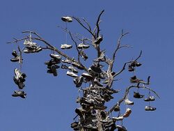 Shoes are sometimes thrown into a tree to festoon it as a "shoe tree".[27] Occasionally, a powerline pole or other wooden object may be decorated in the same way.[27]