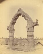 The Singhadwara, which in Sanskrit means "The Lion Gate", is one of the four gates to the temple, and forms the main entrance. The Singhadwara is so named because of two huge statues of crouching lions existing on either side of the entrance. The gate faces eastward, opening on to the Bada Danda or the "Grand Road".[51] The Baisi Pahacha, or the flight of twenty-two steps, leads into the temple complex. A deity of Jagannath known as Patita Pavana, which in Sanskrit means the "saviour of the downtrodden and the fallen", is painted on the right side of the entrance. In ancient times, when untouchables were not allowed inside the temple, they could pray to the Patita Pavana. The statues of the two guards to the temple, Jaya and Vijaya, stand on either side of the doorway.[52] Just before the commencement of the Ratha Yatra, the deities of Jagannath, Balabhadra and Subhadra are taken out of the temple through this gate. On their return from the Gundicha Temple, they have to ceremonially placate Goddess Lakshmi, whose deity is carved atop the door, for neglecting to take her with them on the Yatra. Only then, the goddess allows them permission to enter the temple. A magnificent sixteen-sided monolithic pillar, known as the Aruna Stambha, stands in front of the main gate. This pillar has an idol of Aruna, the charioteer of the sun god, Surya, on its top. One notable fact about the Aruna Stambha is that prior to its current location, it was located in the Konark Sun Temple.[53][54] Later, the Maratha guru, Brahmachari Gosain, brought this pillar from Konark.[55]