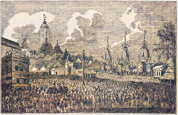 Nabakalabera is a ritual associated with Jagannath,[83] which takes place every 8, 12 or 19 years, when one lunar month of Ashadha is followed by another lunar month of Ashadha. Meaning "New Body", the ritual involves installation of new images in the Jagannath Temple and the burial of the old images at the temple at Koili Vaikuntha. The festival is witnessed by millions of people and its budget exceeds ₹41,000,000 (US$570,000).[84] More than three million devotees are estimated to have visited the temple during the Nabakalevara in 2015, making it one of the most visited festivals in the world.[85]