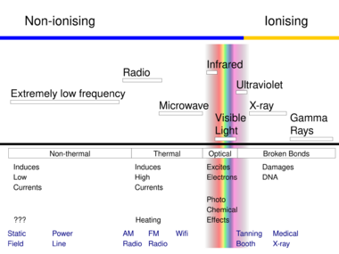 Gamma rays, X-rays, and the higher energy ultraviolet part of the electromagnetic spectrum are ionizing radiation, whereas the lower energy ultraviolet, visible light, nearly all types of laser light, infrared, microwaves, and radio waves are non-ionizing radiation. The boundary between ionizing and non-ionizing radiation in the ultraviolet area cannot be sharply defined, as different molecules and atoms ionize at different energies. The energy of ionizing radiation starts between 10 electronvolts (eV) and 33 eV.