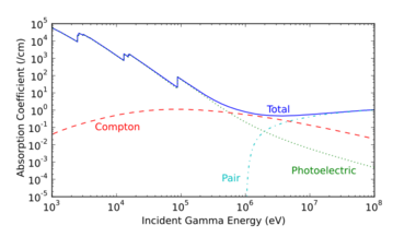 Photoelectric absorption is the dominant mechanism in organic materials for photon energies below 100 keV, typical of classical X-ray tube originated X-rays. At energies beyond 100 keV, photons ionize matter increasingly through the Compton effect, and then indirectly through pair production at energies beyond 5 MeV. The accompanying interaction diagram shows two Compton scatterings happening sequentially. In every scattering event, the gamma ray transfers energy to an electron, and it continues on its path in a different direction and with reduced energy.