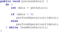 The do keyword is used in conjunction with while to create a do-while loop, which executes a block of statements associated with the loop and then tests a boolean expression associated with the while. If the expression evaluates to true, the block is executed again; this continues until the expression evaluates to false.[11][12]