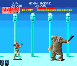 The player controls the robot with a four-way joystick and two attack buttons to punch and kick. The joystick is not only used for crouching, but for jumping as well. Punches and kicks are performed from either a standing, crouching or jumping position.[2] Along the way, there are three types of items that appear as flashing crosses: extra energy stock, invincibility and a long-range laser weapon.[1][2] On occasions, a red orb spawns on the ground and when picked up, increases the robot's punching power up to three times.[1][2]