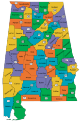 From Ballotpedia There are 67 counties in Alabama, which are divided into 41 judicial circuits. These courts are where the majority of legal matters in Alabama can be addressed. The Circuit Courts have jurisdiction over all felony prosecutions and in proceedings where the disputed amount is more than $10,000. They may also exercise jurisdiction in juvenile courts, in proceedings where the disputed amount is more than $3,000, and in certain appeals from lower courts.[1]