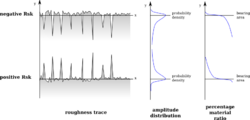 Surface structure is often closely related to the friction and wear properties of a surface.[2] A surface with a higher fractal dimension, large [math]\displaystyle{ Ra }[/math] value, or a positive [math]\displaystyle{ Rsk }[/math], will usually have somewhat higher friction and wear quickly. The peaks in the roughness profile are not always the points of contact. The form and waviness (i.e. both amplitude and frequency) must also be considered.
