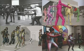 The proprietary Rockstar Advanced Game Engine (RAGE) was used for the game.[52] Garbut found Grand Theft Auto IV's technical design similar to Grand Theft Auto III's, with both games being the first in the series to be released on their respective platforms. He claimed that an operable game engine was not finalised until late in development, at which point "there's still plenty of guesswork" until optimisation near release.[42] The character's physical performances were recorded using motion capture. Up to eight actors could perform on the motion capture stage at one time, each dressed in a full suit.[53] The camera used to capture the performance included a teleprompter for the actors to read their scripts.[54] Over a hundred moves would be captured in each day of production. The final product was taken from different performances by different actors to make them appear seamless and appropriate.[53] The voice work by one actor could be composited over a different actor's physical performance for a specific outcome.[55] The in-game animations were crafted similarly, using a combination of different motion capture performances.[56]