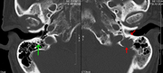 A CT of the brain revealed a lytic lesion in the left temporal bone (right side of image), and petrous temporal bones involving the mastoid segment of the facial nerve canal. Red arrows: lesion; green arrow: normal contralateral facial nerve canal. The lesions are consistent with a myeloma deposit.