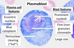 Rarely, Epstein–Barr virus (EBV) is associated with multiple myeloma, particularly in individuals who have an immunodeficiency due to e.g. HIV/AIDS, organ transplantation, or a chronic inflammatory condition such as rheumatoid arthritis.[45] EBV-positive multiple myeloma is classified by the World Health Organization (2016) as one form of the Epstein–Barr virus-associated lymphoproliferative diseases and termed Epstein–Barr virus-associated plasma cell myeloma. EBV-positive disease is more common in the plasmacytoma rather than multiple myeloma form of plasma cell cancer.[46] Tissues involved in EBV+ disease typically show foci of EBV+ cells with the appearance of rapidly proliferating immature or poorly differentiated plasma cells.[46] The cells express products of EBV genes such as EBER1 and EBER2.[47] While the EBV contributes to the development and/or progression of most Epstein–Barr virus-associated lymphoproliferative diseases, its role in multiple myeloma is not known.[48] However, people who are EBV-positive with localized plasmacytoma(s) are more likely to progress to multiple myeloma compared to people with EBV-negative plasmacytoma(s). This suggest that EBV may have a role in the progression of plasmacytomas to systemic multiple myeloma.[47]