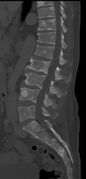 CT scan of the lower vertebral column in a man with multiple myeloma, showing multiple osteoblastic lesions: These are more radiodense (brighter in this image) than the surrounding cancellous bone, in contrast to osteolytic lesions, which are less radiodense.