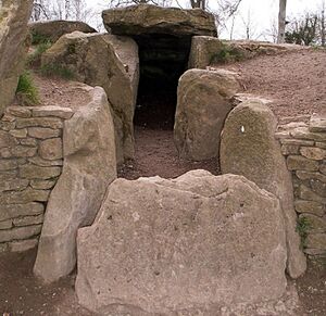 The long barrow tradition originated somewhere in the area of modern Spain, Portugal, and western France; here, the long barrows were first erected in the mid-fifth millennium BCE.[3] The tradition then spread north, along the Atlantic coast.[3] It had reached Britain by the first half of the fourth millennium BCE, either soon after farming or in some cases perhaps just before it, and then moved into other parts of northern Europe, for instance arriving in the area of the modern Netherlands by the second half of the fourth millennium BCE.[3] On the basis of dates ascertained from a number of excavations, Darvill argued that long barrows appeared in the Cotswolds-Severn region fairly abruptly around 3700 BCE.[1] They continued to be built for about 600 years.[5] By 2600 BCE, very few of them had chambers that remained in active use and many had been deliberately blocked up.[6]