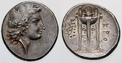 According to Herodotus (The Histories, I.144), the victory tripods were not to be taken from the temple sanctuary precinct, but left there as dedications.[4] Excavations at early sanctuaries, especially Olympia, yielded many hundreds of tripod-bowl vessels, mostly in bronze, deposited as votives. These had a shallow bowl with two handles raised high on three legs; in later versions the stand and bowl were different pieces. During the Orientalising period, the tripods were frequently decorated with figural protomes, in the shape of griffins, sphinxes and other fantastic creatures.[5]