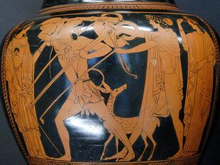 The most famous tripod of ancient Greece was the Delphic Tripod on which the Pythian priestess took her seat to deliver the oracles of the deity. The seat was formed by a circular slab on the top of the tripod, on which a branch of laurel was deposited when it was unoccupied by the priestess. In this sense, by classical times the tripod was sacred to Apollo. According to the myth, Heracles went to the oracle of Delphi in order to ask what to do in order to be expiated from the murder of Iphitos. The oracle did not want to give him an omen. The enraged hero then grabbed the tripod on which the Pythia sat in order to pronounce her oracles. Apollo tried to prevent him and this resulted in a fight between the god and the hero. Finally, Zeus had to intervene in order to end this quarrel. The mytheme of Heracles contesting with Apollo for the tripod appears in vase-paintings older than the oldest written literature.[1] The oracle originally may have been related to the primal deity, the Earth. In the Geometric period, the tripods were fastened to the cauldrons they supported. In the Museum of Delphi there are fragments of such tripods, most distinctive of which is the one with a ring-shaped handle.