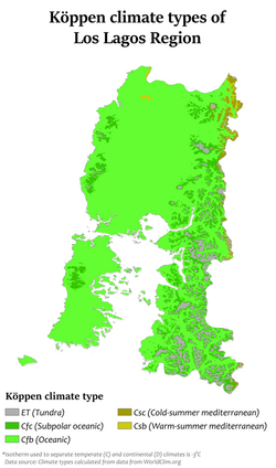 The region, in general, has a natural vegetation of Valdivian temperate rain forest. The coastal part, except for the south of the Chiloé Island, has a temperate climate with cold winter rain. To the south, the climate is characterized by constant rain and not having dry seasons.