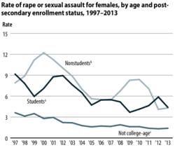 In the United States, several studies since 1987 have indicated that one in four college women have experienced rape or attempted rape at some point in their lifetime. These studies are based on anonymous surveys of college women, not reports to the police, and the results are disputed.[73] In one study, nearly two thirds of students reported knowing victims of rape and over half reported knowing perpetrators of sexual assault. One in ten reported knowing a victim of rape when alcohol was not involved and 22.6% reported knowing a victim of alcohol-facilitated rape.[74] In the documentary The Hunting Ground, the prevalence of sexual assault on college campuses is brought to attention. The schools poor judicial systems are scrutinized for not helping the victims and trying to keep these issues from the public.[75]