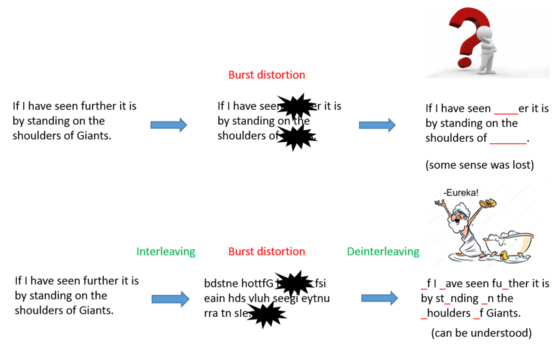 Transmitted sentence: ThisIsAnExampleOfInterleaving... Error-free transmission: TIEpfeaghsxlIrv.iAaenli.snmOten. Received sentence with a burst error: TIEpfe______Irv.iAaenli.snmOten. Received sentence after deinterleaving: T_isI_AnE_amp_eOfInterle_vin_...