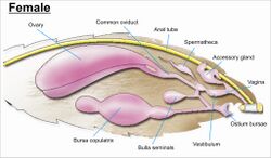 In general zoology, given the great variety in organs, physiologies, and behaviors involved in copulation, male genitalia are more strictly defined as "all male structures that are inserted in the female or that hold her near her gonopore during sperm transfer"; female genitalia are defined as "those parts of the female reproductive tract that make direct contact with male genitalia or male products (sperm, spermatophores) during or immediately after copulation".[4]