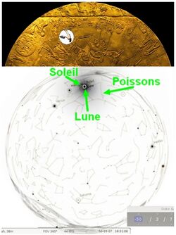 Sylvie Cauville[12] and Éric Aubourg dated it to 50 BC through an examination of the planetary configuration. It depicts the five planets known to the Egyptians, in a configuration that occurs once every thousand years, and the identification of two eclipses.[13]